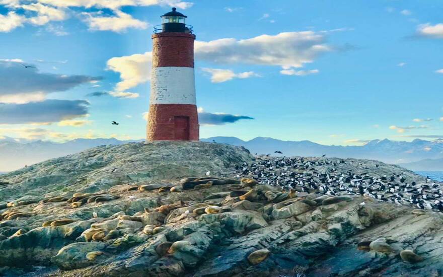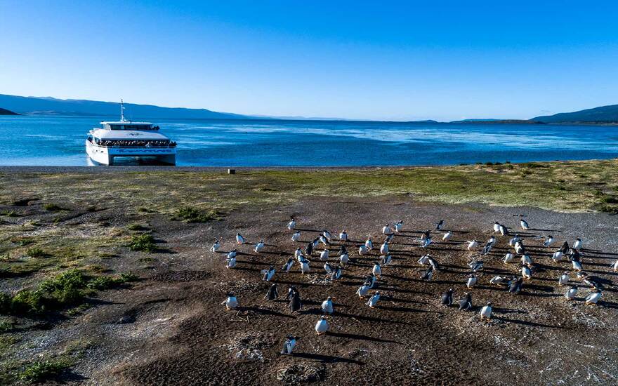 Ambas islas pertenecen al archipiélago Bridges. Al llegar al Faro Les Eclaireurs (Los Iluminadores), podremos apreciar las colonias de Cormoranes Imperiales y Cormoranes Roqueros; y también escuchar la historia del hundimiento del SS Monte Cervantes que protagonizó en 1930. Continuando, navegaremos hacia el Este disfrutando de los maravillosos paisajes del canal y las montañas que lo rodean, allí divisaremos sobre la costa Argentina Puerto Almanza y sobre la costa Chilena la Base Naval Puerto Williams, y luego llegaremos a la Isla Martillo donde tendremos la oportunidad de ver una colonia de Pingüinos Magallánicos y algunos ejemplares de pingüinos Papua. Luego de permanecer un tiempo observando sus movimientos y su conducta, retornaremos a puerto vía marítima.